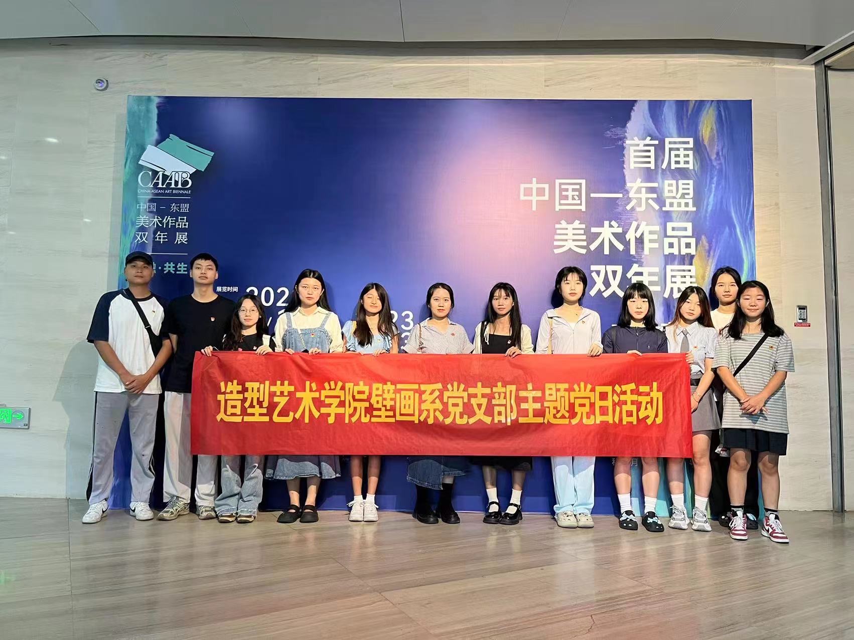 “交融共生”首届中国-东盟美术作品双年展于9月17日-23日在广西美术馆展出,展览涵盖了中国及东盟国家著名艺术家作品共200余件。艺术家们通过艺术的方式展示各自的文化精神、文化特点,体现了各美其美、美美与共的和谐画面,共创中国与东盟之间的文化繁荣。活动开始前,党支部书记唐露老师指出本次活动是党建+专业的一次深入融合,希望全体党员进一步深入学习党的二十大精神,巩固深化主题教育成果,深入学习习近平总书记在文化传承发展座谈会上的讲话,增强文化自觉,坚定文化自信,进一步提升自身修养和思想境界,将红色文化自觉融入专业知识。