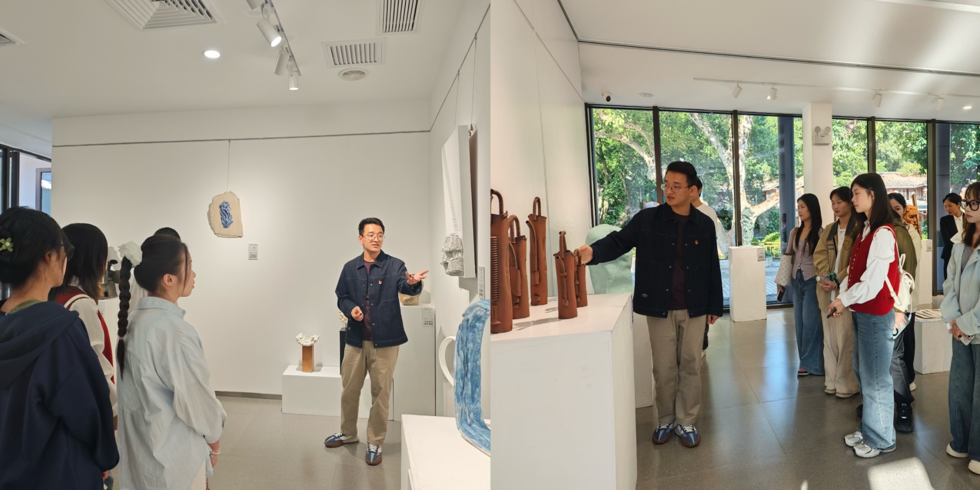 在观展的过程中,党支部书记从陶艺作品的表达形式、表现主题等方面进行讲解,让同学们对此次展览展出的作品有了更加深刻的认识。活动中,支部书记强调陶艺创作要立足于文化传承,不断深挖传统文化精髓,将其与当代陶艺表现有机结合,运用陶艺创作的表达手法努力创作人民喜闻乐见的艺术作品。之后,学生党员还从不同角度对其中的作品进行探讨和交流。